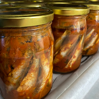 В банку 0,5л у меня уместилось примерно: 240г рыбы и 280г соуса