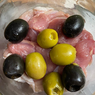 В банки уложить мясо кусочками по 25-30 г, перец кубиком 2х2 см, соль, сахар, оливки, маслины и залить соусом.