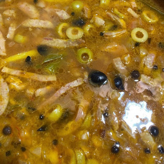 Отправить зажарку в кастрюлю. Добавить нарезаные маслины, оливки, лаврушку, перцы и соль. Варить минут 20 при слабом кипении.