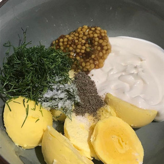 Желтки размять вилкой, добавить майонез, горчицу, укроп, соль, перец.