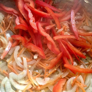 Овощи нарезать соломкой. Обжарить лук, морковь, чеснок, имбирь 2 минуты. Добавить сладкий перец ещё 1 минуту