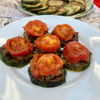 Цукини с шампиньонами и жареными помидорами. Замечательная закуска! У меня кабачки (цукини) теперь каждый день. Любовь к ним пришла с годами. Года 3 назад я поняла, что они совсем не безвкусные, а макароны (паста) с цукини - это отдельная любовь!